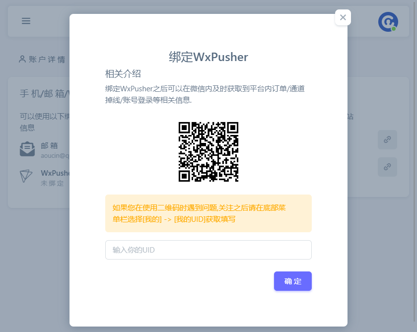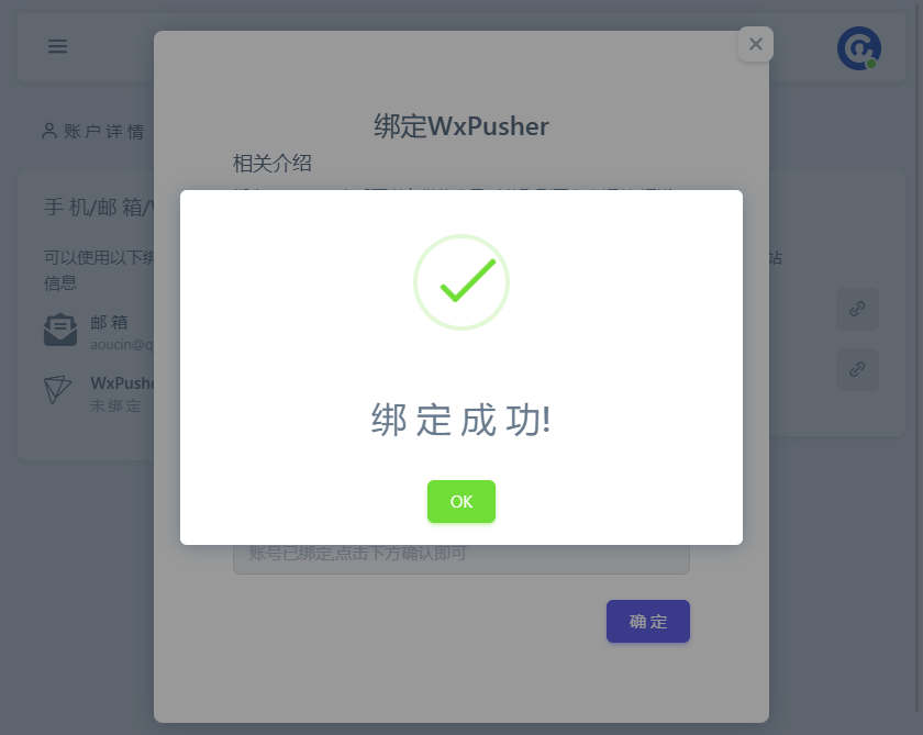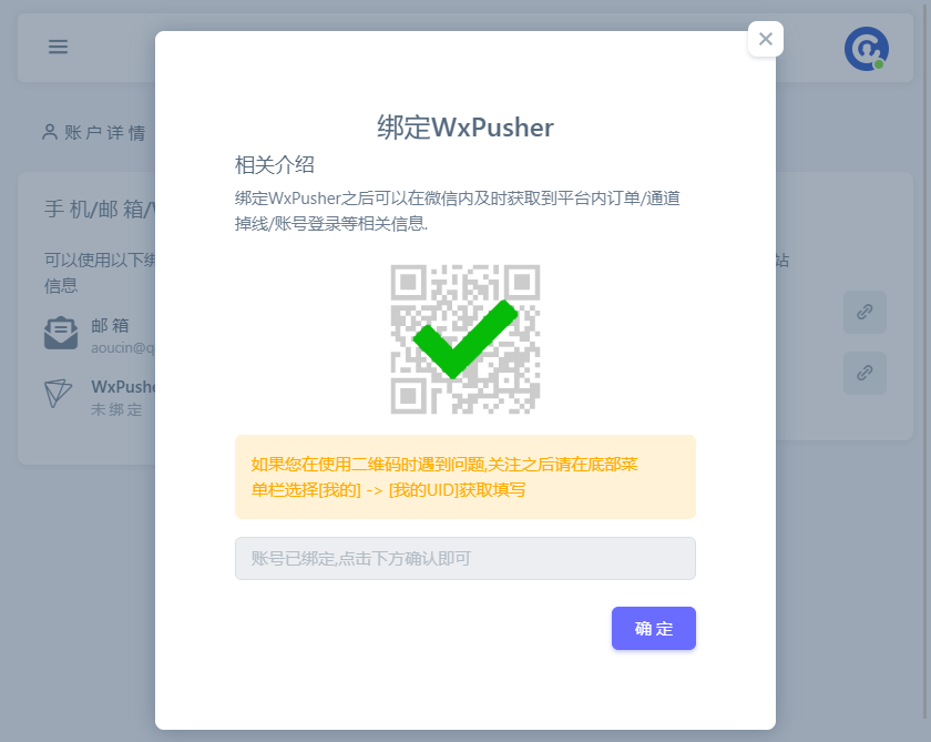 在关注了公众号后,返回用户中心并点击确定,完成绑定。